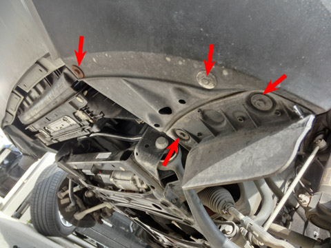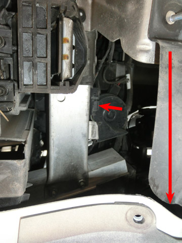 写真3 取り外したアンダーカバーエンジンルームの右前側を下から覗くと写真4のようなPDCセンサ配線用のコネクタが見えるので、これを外しておく。写真4の右側の長い赤矢印は車両前方方向を表している。