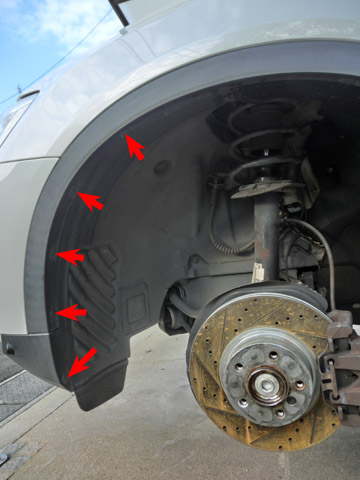 写真9 フェンダーカバーの前側そして、写真10の赤矢印で示すネジやプラスチックナットを外す。