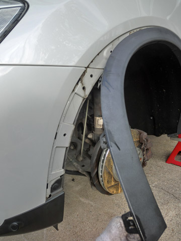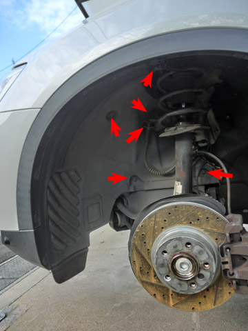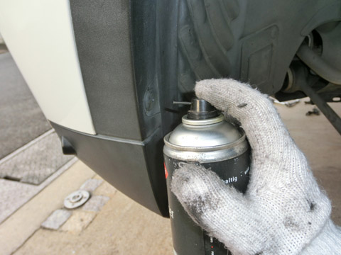 写真11 フロントバンパー端の下側写真12にタイヤハウスカバーを外したところを示す。車両右側のタイやハウスカバーも同様にして外す。