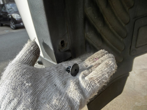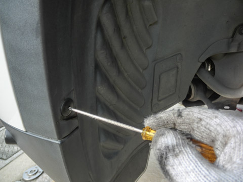 写真10 タイやハウスカバーを固定しているネジやプラスチックナット最後に、フロントバンパー端の下にある写真11のネジを外すと、タイやハウスカバーを外すことができる。