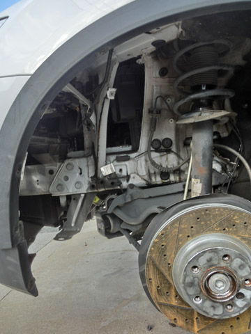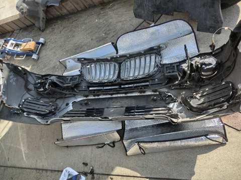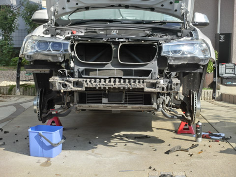 写真29 フロントバンパーを外した車体フロントバンパーを外したときにいつも思うのだが、フロントバンパーを外しただけで一気に解体車っぽくなる。どうしてだろう?