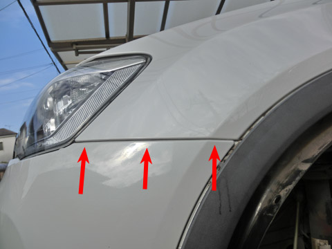 写真12 タイヤハウスカバーを外したところ写真13はフロントバンパーの端の部分であるが、この裏側の3か所でフロントフェンダーに固定されている。両端の2か所はT-30のトルクスボルトで固定されており、真ん中はプラスチックリベットで固定されているので、これらを外す。