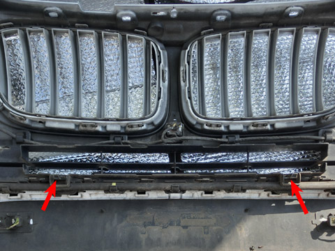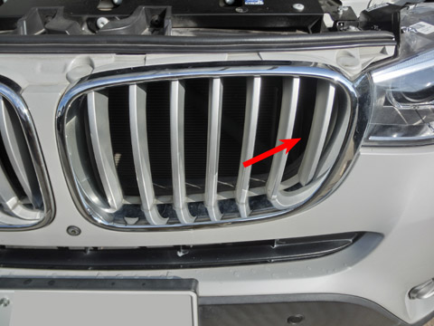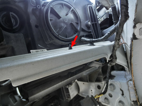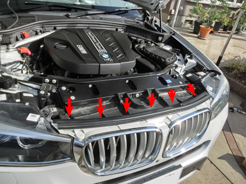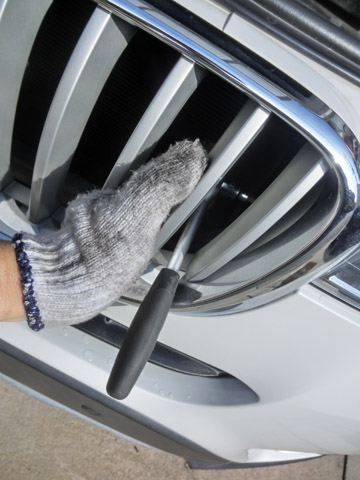 写真23 フロントグリルの奥のボルトこれを写真24のようにT-30のトルクスビットとラチェットレンチを使って外す。ボルトを落とさないように注意しよう。