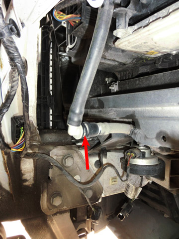 写真21 ヘッドライトウォッシャーパイプのコネクタを外したところコネクタを外したらヘッドライトウォッシャー液が出てくるので、写真22のように下にバケツを置いておこう。