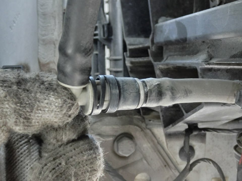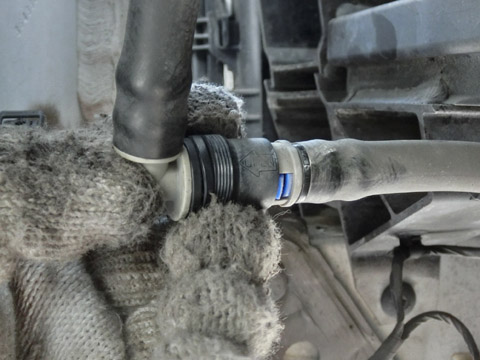 写真20 コネクタスリーブを引っ張っているところすると、写真21のようにロックが外れてヘッドライトウォッシャーパイプのコネクタが外れる。