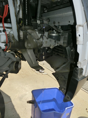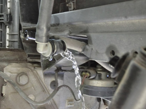 写真22 ヘッドライトウォッシャー液をバケツで受けているところさて、次の工程は少し難しい。写真23に示すフロントグリルの奥の横にT-30のボルトがある。
