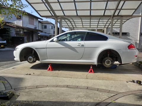 そろそろDD2号(E63)が車検の時期なので、その前にブレーキフルードを交換しておきたいところだ。以前から、DD2号(E63)のブレーキフルードタンクの内側に濃い緑色の藻のようなものがこびりついているのが気になっていた。詳しくはわからないのだが、BMW純正のブレーキフルードが入っていたタンクに、国産車用のブレーキフルードを入れたために、緑色の何かが析出したように思う。今回はブレーキフルードを交換するタイミングでタンクも綺麗な新しいものに交換しておこう。まずは、写真1のように前後ともにウマをかけてホイールを外す。