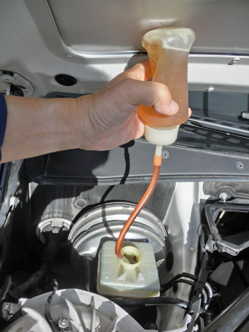 写真16 古いブレーキフルードを抜いているところすべての車輪のキャリパーから古いブレーキフルードを抜いたら、写真17のようにタンクのMAXの位置まで新しいブレーキフルードを入れればいい。