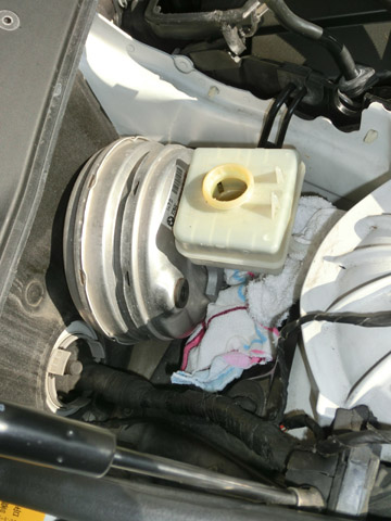 写真14 新しいタンクを取りつけたところ最後に、写真15のようにタンクに新しいブレーキフルードを入れ、各輪のブレーキキャリパーから古いフルードを抜いていく。