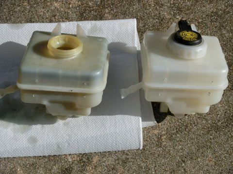 写真12 タンクの新旧比較(左:旧、右:新)古いタンクはタンク上方の内側に汚れがあるのがわかるだろうか。ちなみに、古いタンクは写真13のようにTRW社製のものだ。