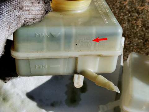 写真3 ブレーキフルードタンクこのブレーキフルードタンクを横から見てみると、写真4の赤矢印のタンク内側に濃い緑色の汚れが付着しているのが見えるだろう。
