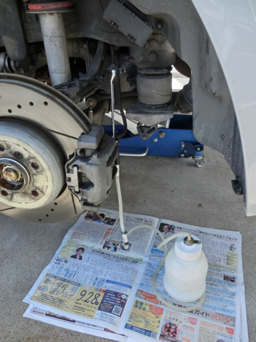 写真15 新しいブレーキフルードを入れているところちなみに、用意したブレーキフルードは古河薬品工業(「ふるかわ」ではなく「こが」と読む)のDOT4のものであり、価格は1,092円であった。古いブレーキフルードを抜く時は、マスターシリンダーから遠い順、すなわち、左後ろ、右後ろ、左前、右前の順に写真16のようにキャリパーにワンウェイバルブ付きのボトルを取り付けて抜いていく。