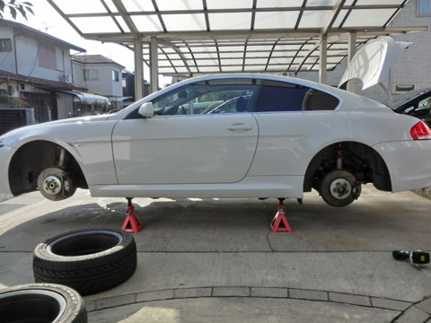 今回はフェンダーアーチ内の足回りも洗浄したいので、写真1のように前後にウマをかけて4輪ともホイールを外す。