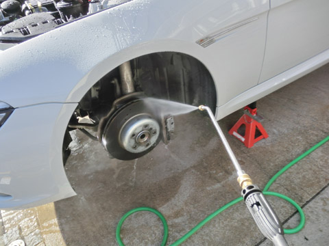 写真5 エンジンルームを洗っているところさらに、写真6のようにフェンダーアーチ内や足回りも念入りに洗う。