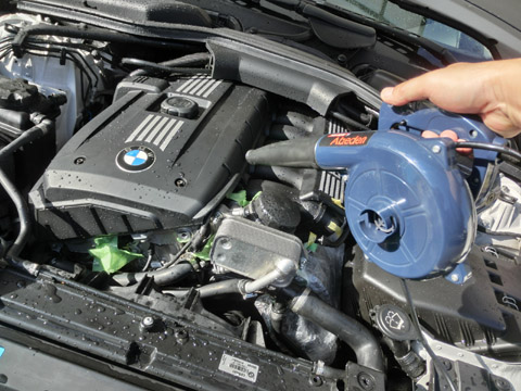 写真6 足回りを洗っているところ一通り洗えたら、写真7のようにブロワーで水滴を飛ばしていく。細かいところまで念入りに水を飛ばしておこう。
