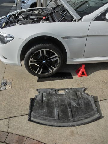 写真1 ウマをかけたところそして、エンジンルーム下のアンダーパネル(スプラッシュガード)を取り外す。写真2に取り外したアンダーパネルを示す。