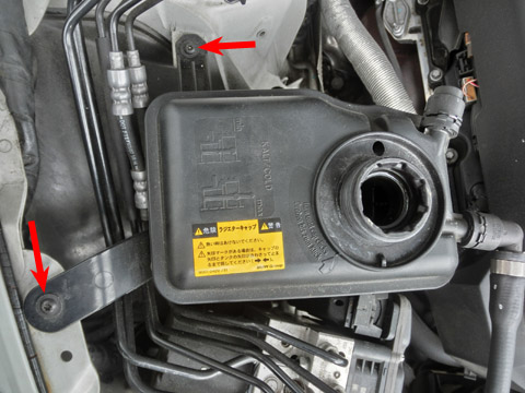 写真5 クーラントを抜いているところクーラントが抜けたらエキスパンションタンクを外す。エクスパンションタンクは写真6の2つのT-20トルクスネジで固定されているので、まずそれらを外す。
