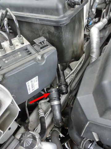 写真8 ホースを外したところ一方、写真9のようにエキスパンションタンクの下にもワンタッチコネクタがある。
