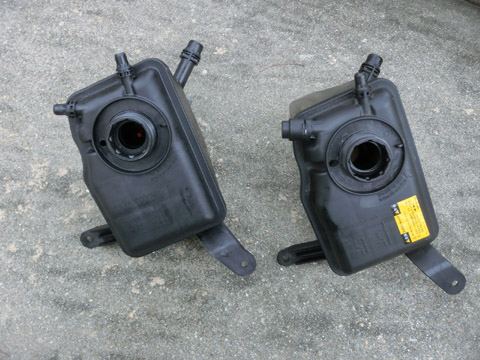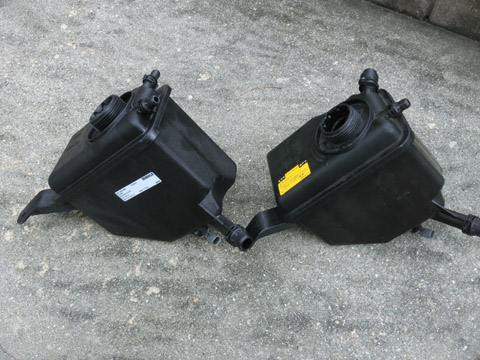 写真12 横から見たエキスパンションタンクの新旧比較(左:新、右:旧)用意した新しいエキスパンションタンクはMAHLE製で、価格は8,943円であった。新しいエキスパンションタンクを取り付けるときには、写真13の赤矢印のゴムブッシュにエキスパンションタンクの下の突起が入るようにしよう。