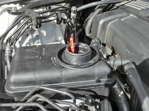 写真14 交換後のエキスパンションタンクあとはラジエターのドレインコックを閉めてから、このレポートのように新しいクーラントを入れてエア抜きすればいい。エア抜き後は、写真15のようにタンクのMAXまでクーラントを追加しておく。新しいエキスパンションタンクにはクーラントの量を示す棒があるので、クーラント量を確認しやすい。