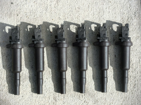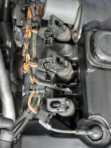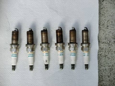 写真13 プラグを取り付けているところさて、プラグ洗浄後にしばらく車を走らせてみたが、信号待ちで留まっているときなど、アイドリング時にたまに1気筒だけ一瞬失火するときがある。すぐに回転はスムーズに戻るのだが、ちょっと気になる。それになんか排気ガスが生ガス臭いし燃費もあまりよくない。イグニッションコイルの被覆が剥げてきいるものもあるし、そろそろイグニッションコイルの寿命なのか・・・?