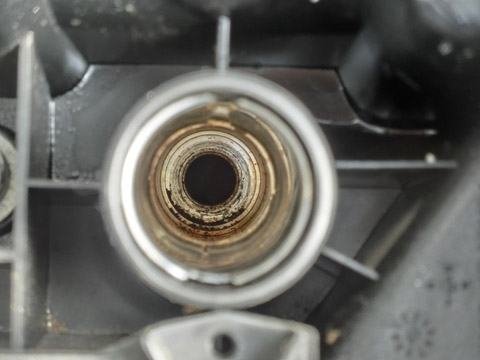 写真5 被覆が剥けているイグニッションコイルそれはともかく、プラグを外そう。プラグを外す際には、写真6のようにプラグホールにオイルが溜まっていないかどうか確認しておこう。