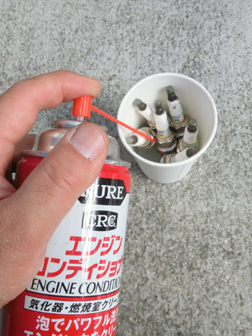 写真9 エンジンコンディショナーを入れているところエンジンコンディショナーをたっぷり入れた後、写真10のようにしばらくプラグを漬けておく。