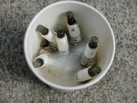 写真10 プラグを漬けているところ10分ほどしたら、写真11のように1本ずつ歯ブラシでプラグの先に付いている煤を洗浄していく。