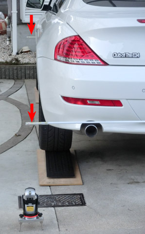 写真2 リアバンパーにアルミ棒を固定したところそして、写真3のように車体の横にレーザー水準器を置いて、レーザー面から各タイヤの上下左右までの距離を測定する。